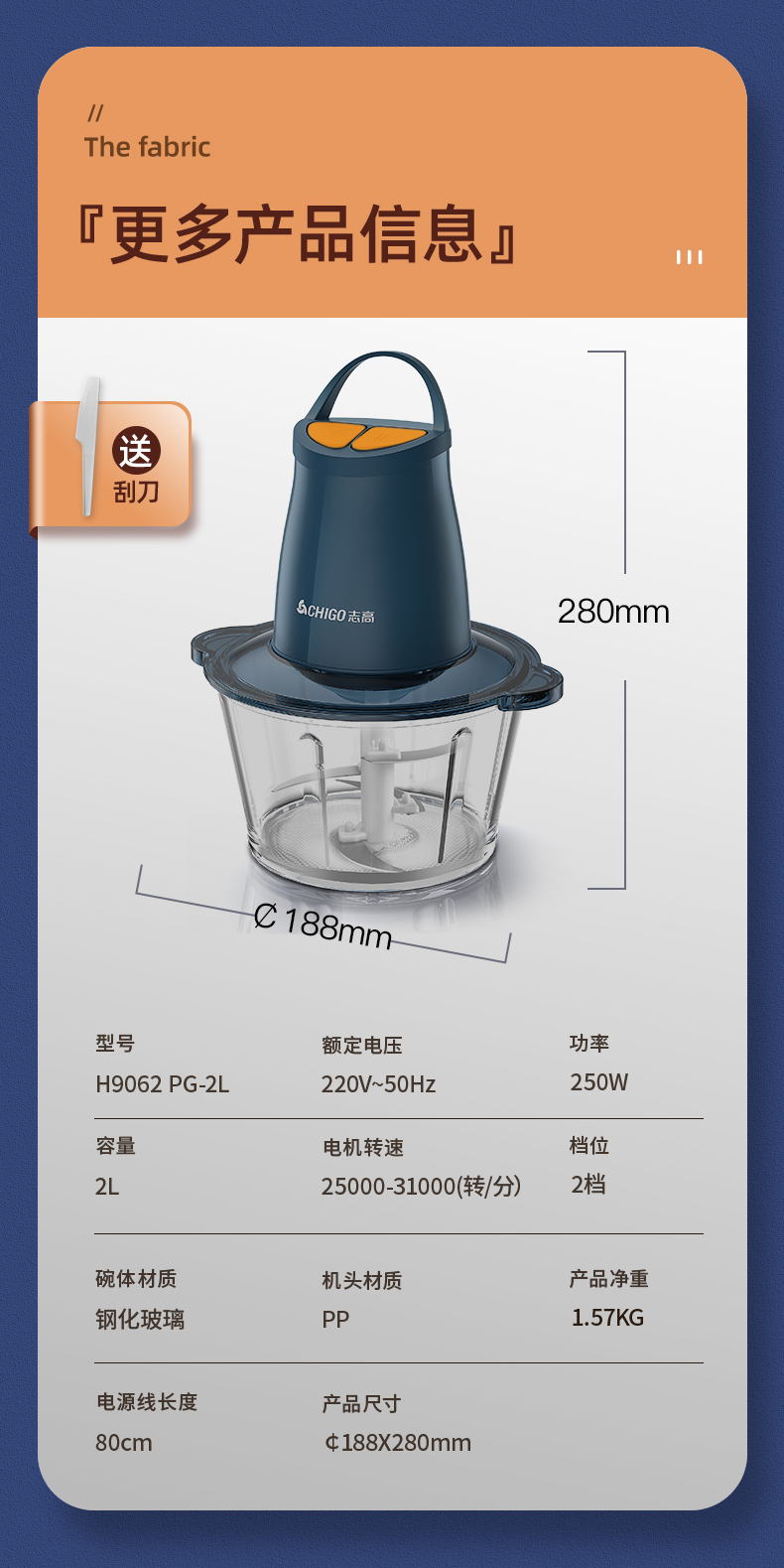 两档绞肉,2L钢化玻璃碗,双层四叶刀